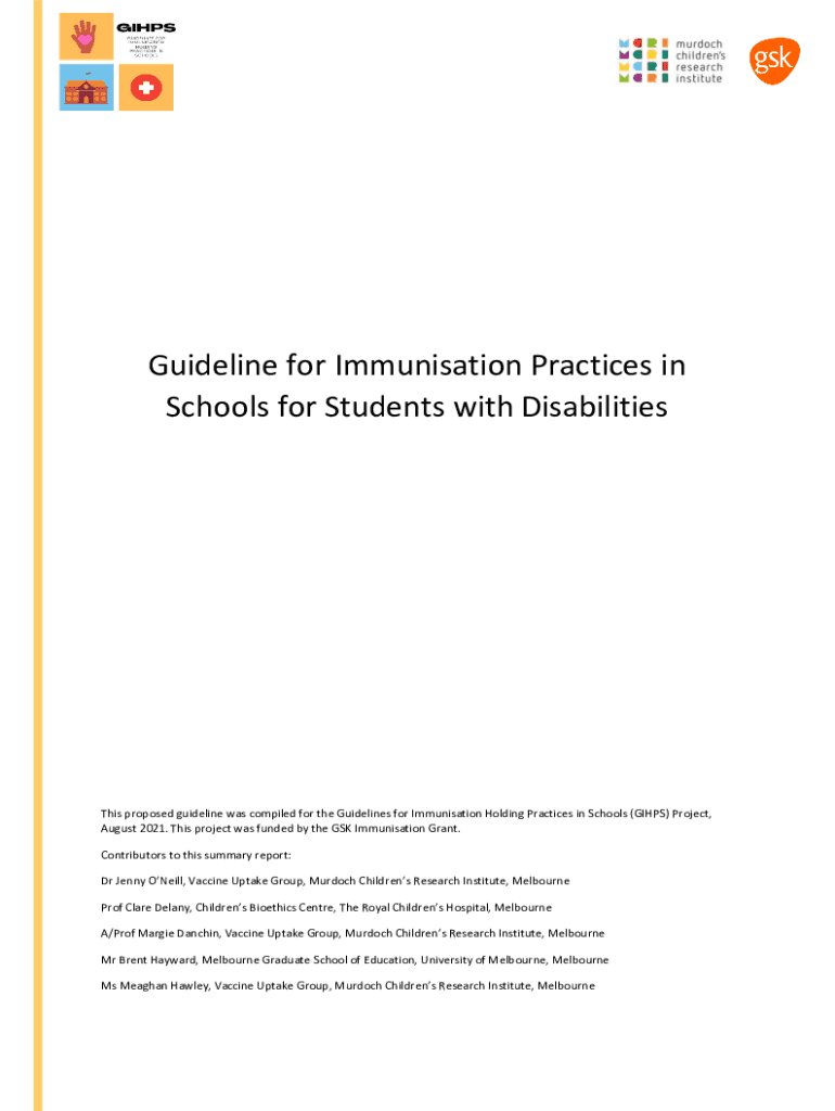 Guideline for Immunization Practices in Schools for Students with DisabilitiesThis proposed guideline was compiled for the Guidelines for Immunization Holding Practices in Schools (GIMPS) Project,