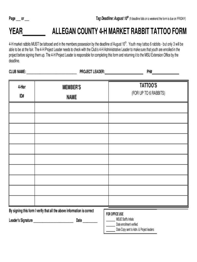 Tag Deadline: August 10th (If deadline falls on a weekend the form is due on FRIDAY)Page ___ or ___YEARALLEGAN COUNTY 4H MARKET RABBIT TATTOO FORM4H market rabbits MUST be tattooed and in the members'