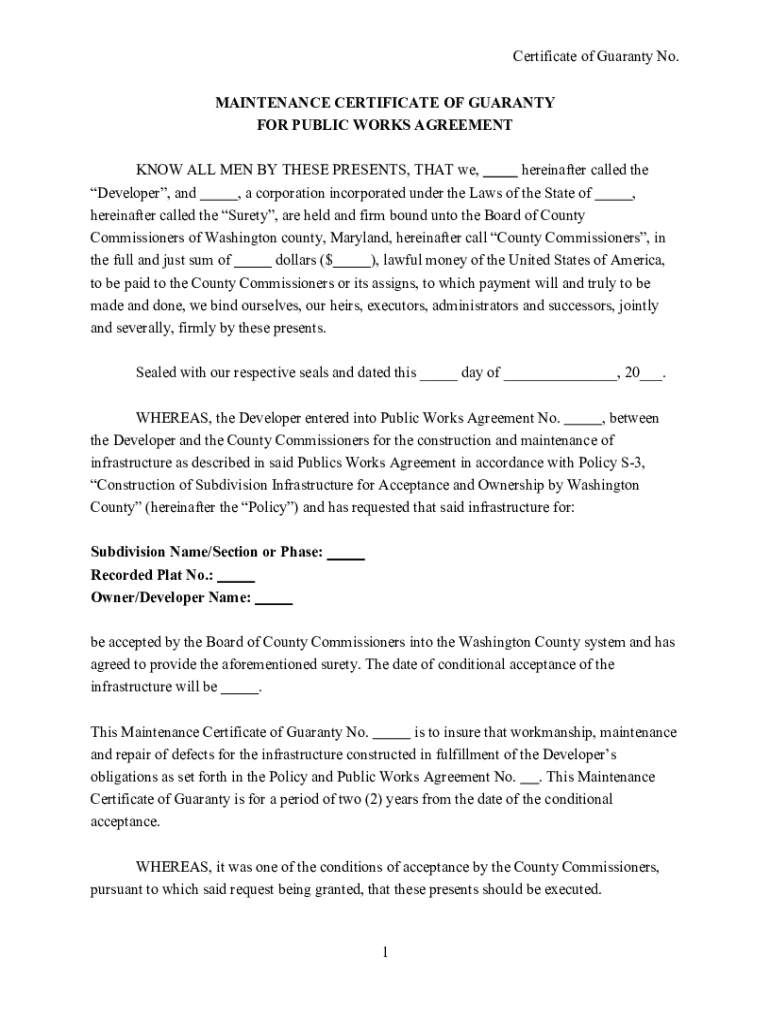 Certificate of Guaranty No. MAINTENANCE CERTIFICATE OF GUARANTY FOR PUBLIC WORKS AGREEMENT KNOW ALL MEN BY THESE PRESENTS, THAT we, hereinafter called the Developer, and, a corporation incorporated