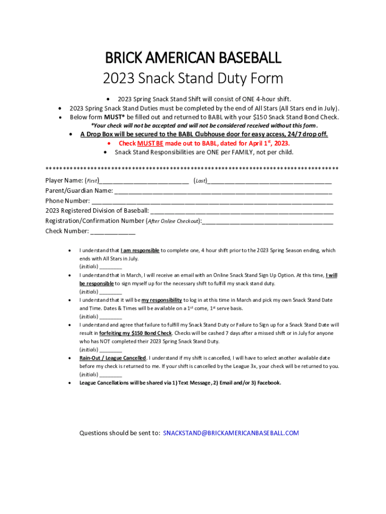BRICK AMERICAN BASEBALL 2023 Snack Stand Duty Form 2023 Spring Snack Stand Shift will consist of ONE 4hour shift. 2023 Spring Snack Stand Duties must be completed by the end of All Stars (All Stars
