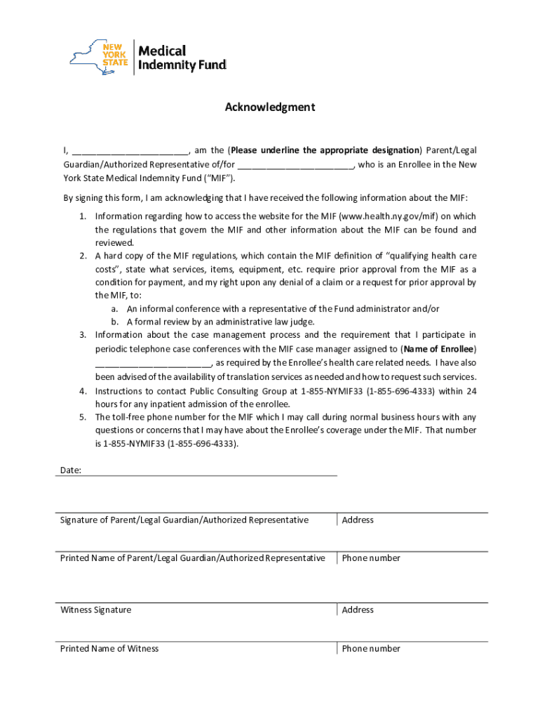 Get the free NEW YORK STATE MEDICAL INDEMNITY FUND BILL. Acknowledgement Form
