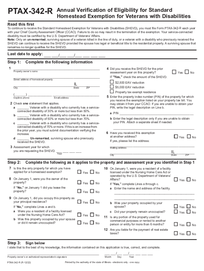 PTAX342RAnnual Verification of Eligibility for Standard Homestead Exemption for Veterans with DisabilitiesRead this first continue to receive the Standard Homestead Exemption for Veterans with Disabilities