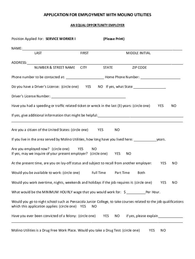 APPLICATION FOR EMPLOYMENT WITH MOLINA UTILITIES AN EQUAL OPPORTUNITY EMPLOYERPosition Applied For: SERVICE WORKER I(Please Print)NAME:___ LAST FIRST MIDDLE INITIAL ADDRESS:___ NUMBER & STREET NAME