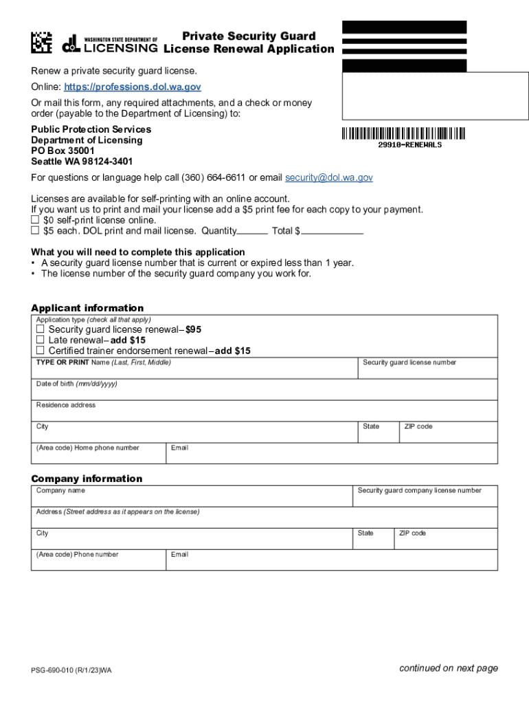Private Security Guard License Renewal Application Renew a private security guard license. Online: https://professions.dol.wa.gov Or mail this form, any required attachments, and a check or money