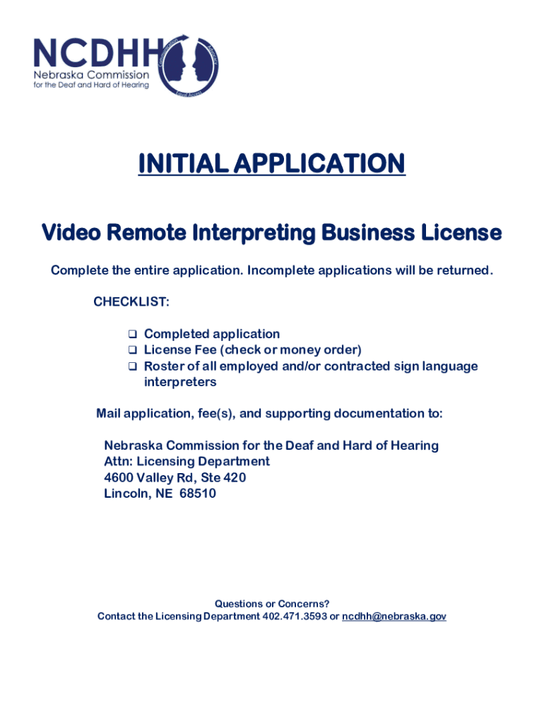 INITIAL APPLICATION Video Remote Interpreting Business License Complete the entire application. Incomplete applications will be returned. CHECKLIST: Completed application License Fee (check or money