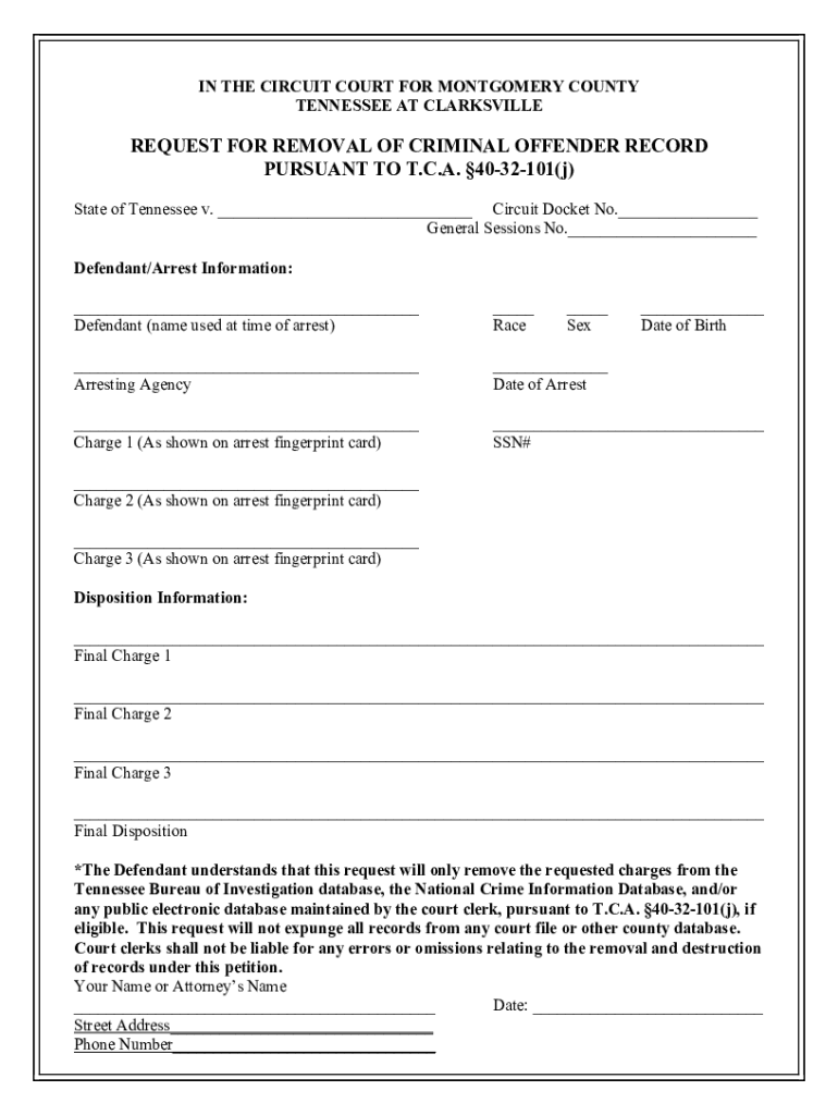 IN THE CIRCUIT COURT FOR MONTGOMERY COUNTY TENNESSEE AT CLARKSVILLEREQUEST FOR REMOVAL OF CRIMINAL OFFENDER RECORD PURSUANT TO T.C.A. 4032101(j) State of Tennessee v. ___ Circuit Docket No.___ General