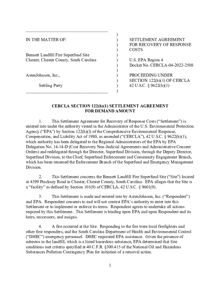 ___))))))))))))IN THE MATTER OF: Bennett Landfill Fire Superfund Site Chester, Chester County, South Carolina AstenJohnson, Inc., Settling Party ___SETTLEMENT AGREEMENT FOR RECOVERY OF RESPONSE COSTS