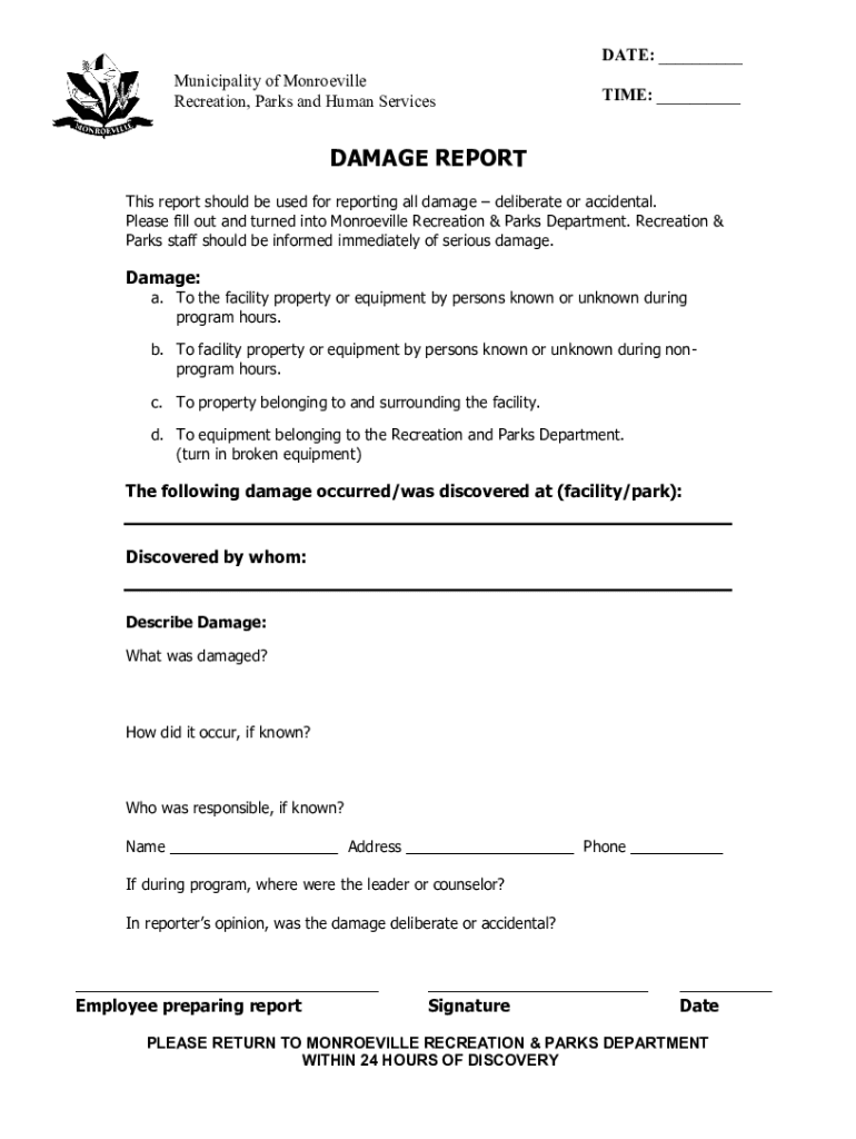 DATE: ___ Municipality of Monroeville Recreation, Parks and Human Services TIME: ___DAMAGE REPORT This report should be used for reporting all damage deliberate or accidental. Please fill out and