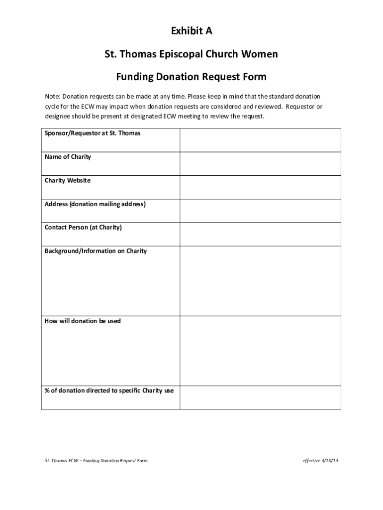 Exhibit A St. Thomas Episcopal Church Women Funding Donation Request Form Note: Donation requests can be made at any time. Please keep in mind that the standard donation cycle for the ECW may impact