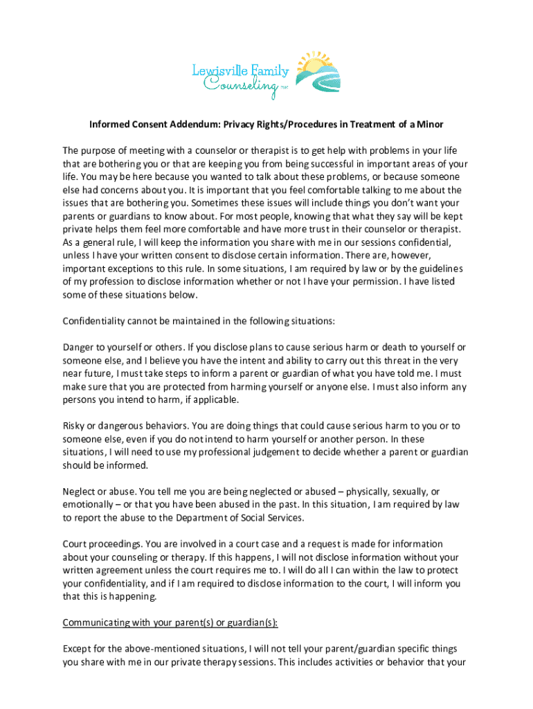 Informed Consent Addendum: Privacy Rights/Procedures in Treatment of a Minor The purpose of meeting with a counselor or therapist is to get help with problems in your life that are bothering you or