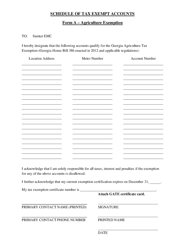 SCHEDULE OF TAX EXEMPT ACCOUNTS Form A Agriculture Exemption TO:Sumter EMC hereby designate that the following accounts qualify for the Georgia Agriculture Tax Exemption (Georgia House Bill 386 enacted