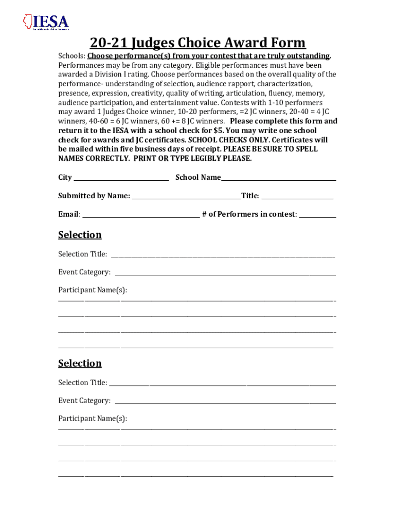 2021 Judges Choice Award Form Schools: Choose performance(s) from your contest that are truly outstanding. Performances may be from any category. Eligible performances must have been awarded a Division