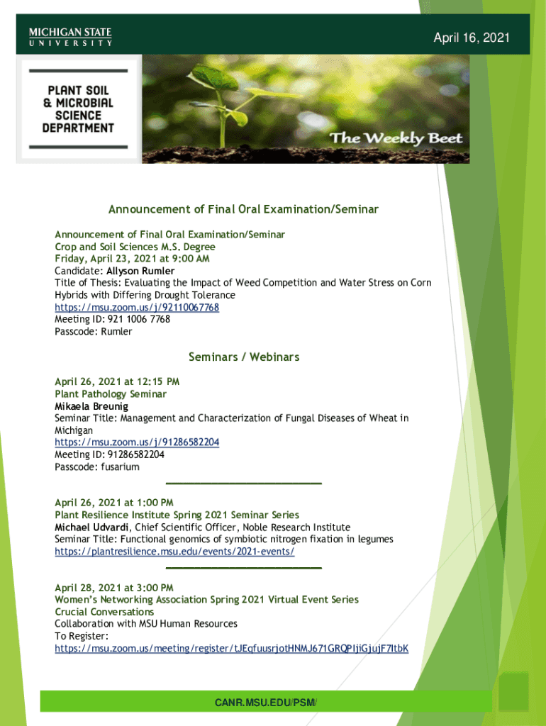 April 16, 2021TITLE SUBTITLE Announcement of Final Oral Examination/Seminar Announcement of Final Oral Examination/Seminar Crop and Soil Sciences M.S. Degree Friday, April 23, 2021, at 9:00 AM Candidate:
