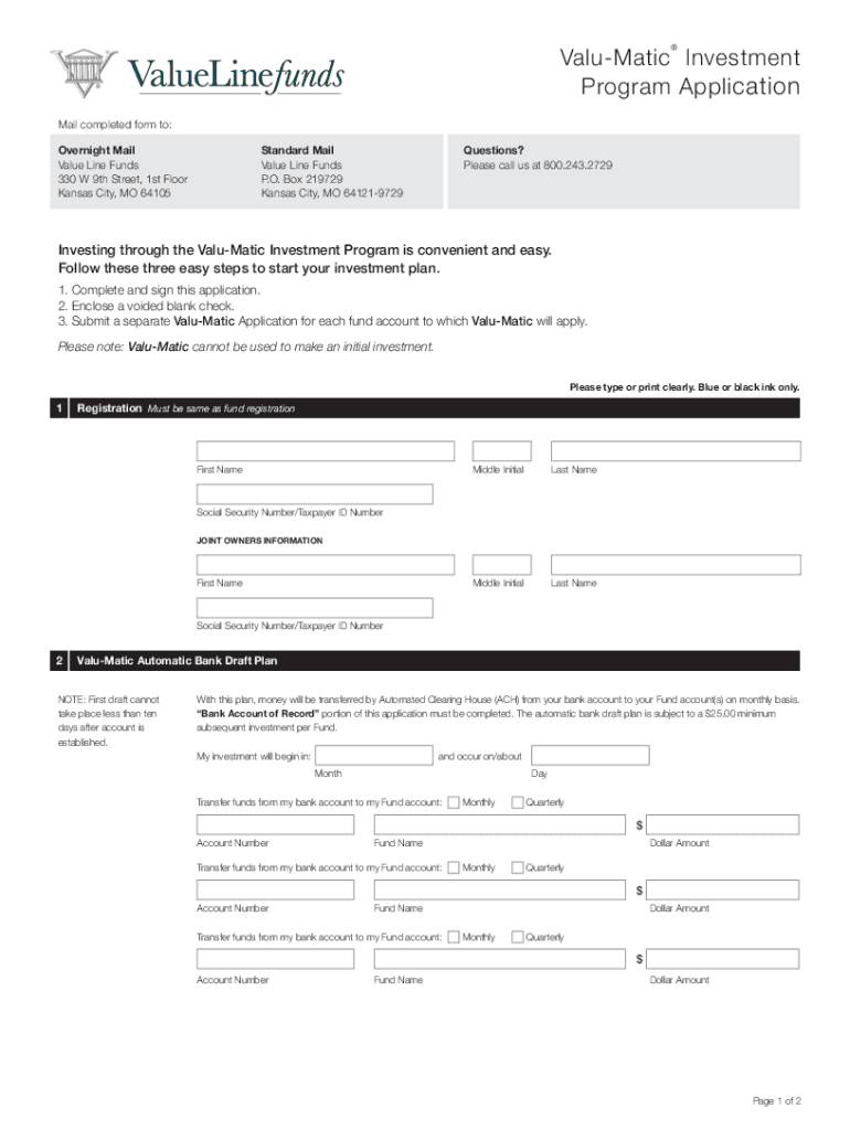 Aquatic Investment Program Application Mail completed form to: Overnight Mail Value Line Funds 330 W 9th Street, 1st Floor Kansas City, MO 64105Standard Mail Value Line Funds P.O. Box 219729 Kansas