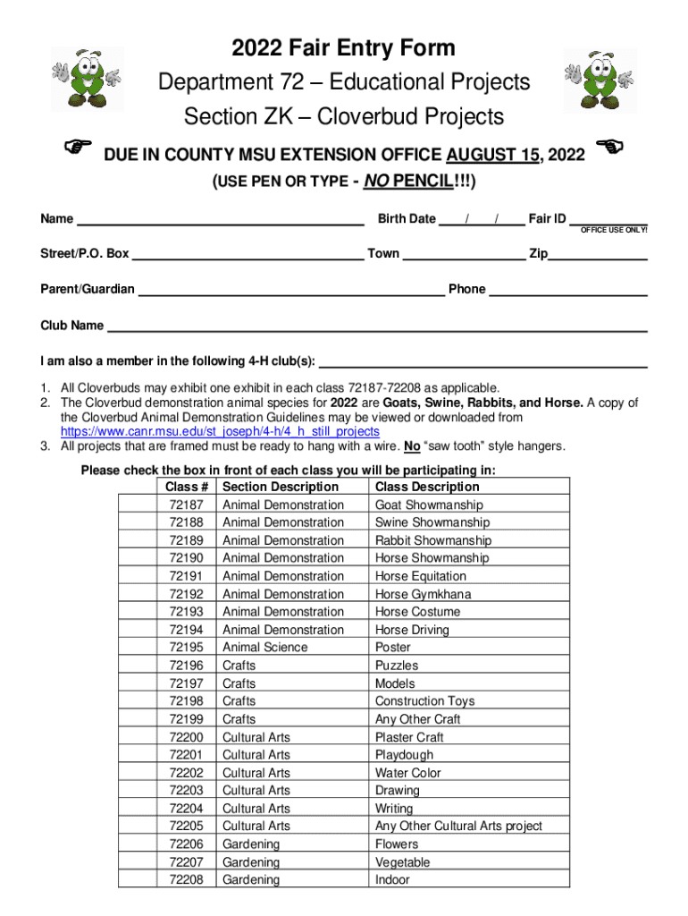 PRINT2022 Fair Entry Form Department 72 Educational Projects Section OK Clover bud Projects DUE IN COUNTY MSU EXTENSION OFFICE AUGUST 15, 2022 (USE PEN OR TYPE NO PENCIL!!!) Rebirth Date//Fair ID