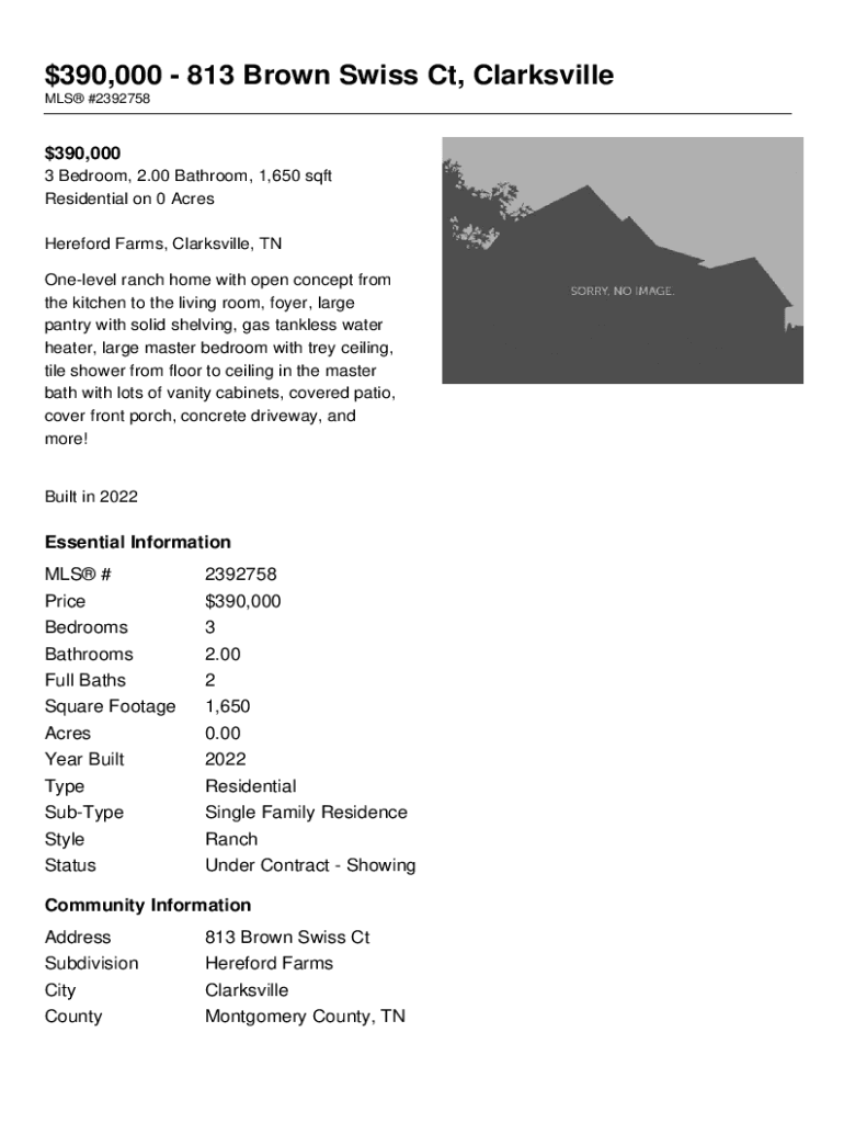 $390,000 813 Brown Swiss Ct, Clarksville MLS #$2392758390,000 3 Bedroom, 2.00 Bathroom, 1,650 soft Residential on 0 Acres Hereford Farms, Clarksville, TN One level ranch home with open concept from