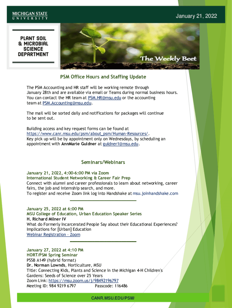 January 21, 2022TITLE SUBTITLE PSM Office Hours and Staffing Update The PSM Accounting and HR staff will be working remote through January 28th and are available via email or Teams during normal business