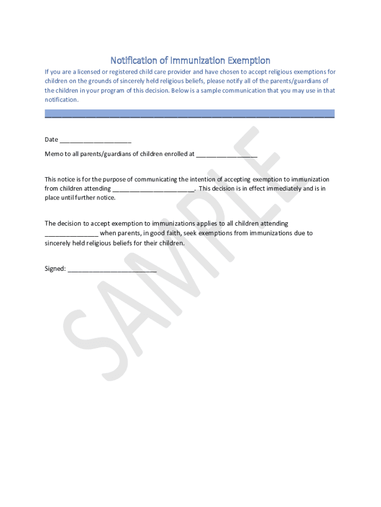 Notification of Immunization Exemption If you are a licensed or registered child care provider and have chosen to accept religious exemptions for children on the grounds of sincerely held religious