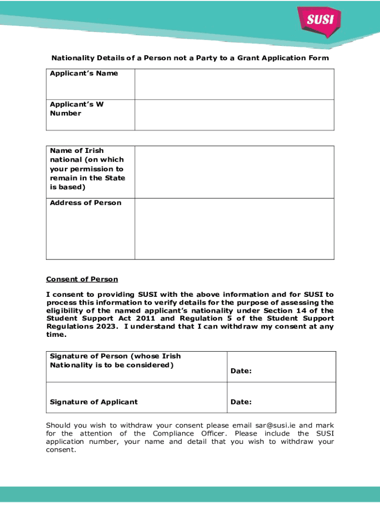 Nationality Details of a Person not a Party to a Grant Application Form Applicants NameApplicants W Cumbersome of Irish national (on which your permission to remain in the State is based) Address