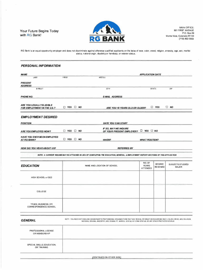 (719) 8525933RGBANKRG Bank is an equal opportunity employer and does not discriminate against