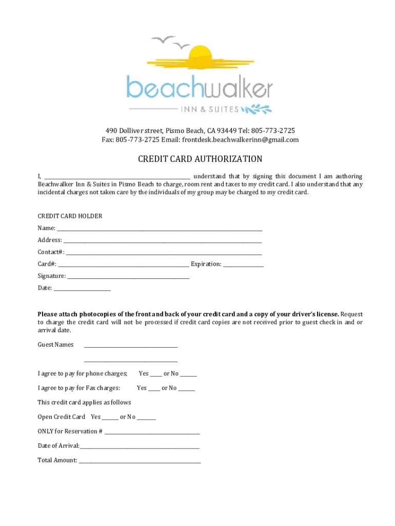 490 Deliver street, Pis mo Beach, CA 93449 Tel: 8057732725 Fax: 8057732725 Email: frontdesk.beachwalkerinn@gmail.comCREDIT CARD AUTHORIZATION I, ___ understand that by signing this document I am authoring