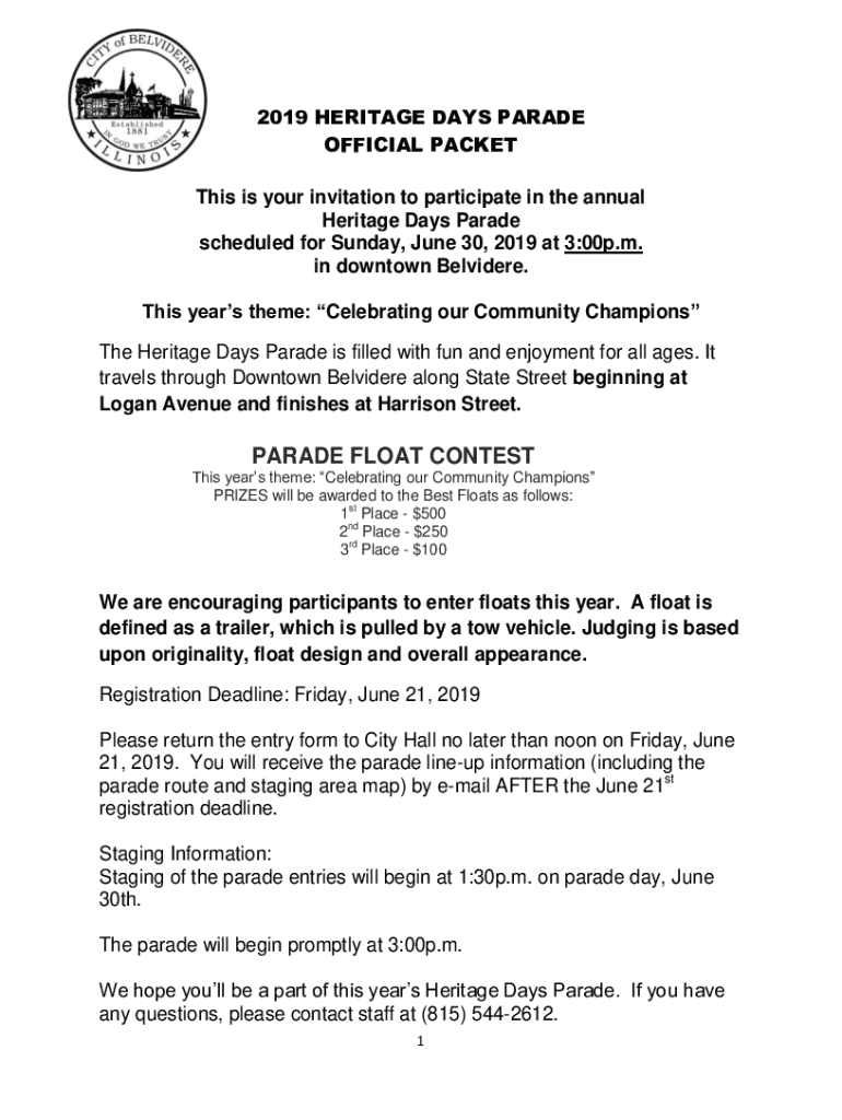 2019 HERITAGE DAYS PARADE OFFICIAL PACKET This is your invitation to participate in the annual Heritage Days Parade scheduled for Sunday, June 30, 2019, at 3:00p.m. in downtown Belvedere. This year's