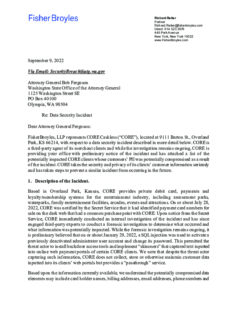 Richard Rater Partner Richard.Reiter@fisherbroyles.com Direct: 914.523.2976 445 Park Avenue New York, New York 10022 www.FisherBroyles.comSeptember 9, 2022 Via Email: SecurityBreach@atg.wa.gov Attorney