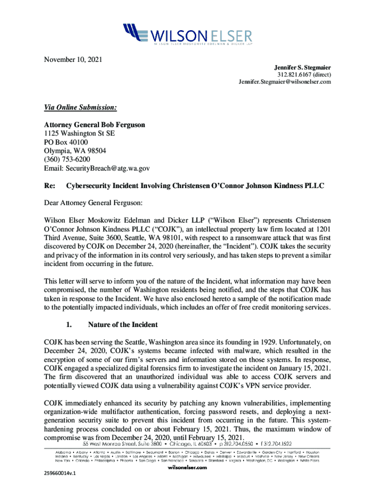 November 10, 2021, Jennifer S. Steamier 312.821.6167 (direct) Jennifer.Stegmaier@wilsonelser.comVia Online Submission: Attorney General Bob Ferguson 1125 Washington St SE PO Box 40100 Olympia, WA