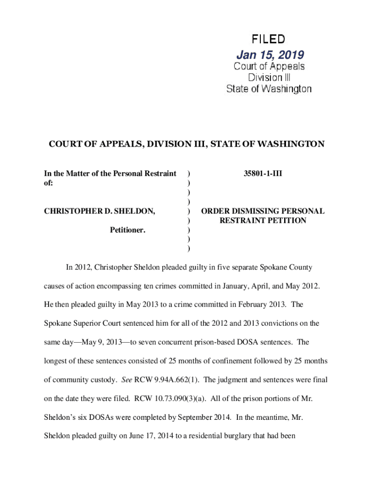 Jan 15, 2019COURT OF APPEALS, DIVISION III, STATE OF WASHINGTON In the Matter of the Personal Restraint of:CHRISTOPHER D. SHELDON, Petitioner.) ))))))))358011IIIORDER DISMISSING PERSONAL RESTRAINT
