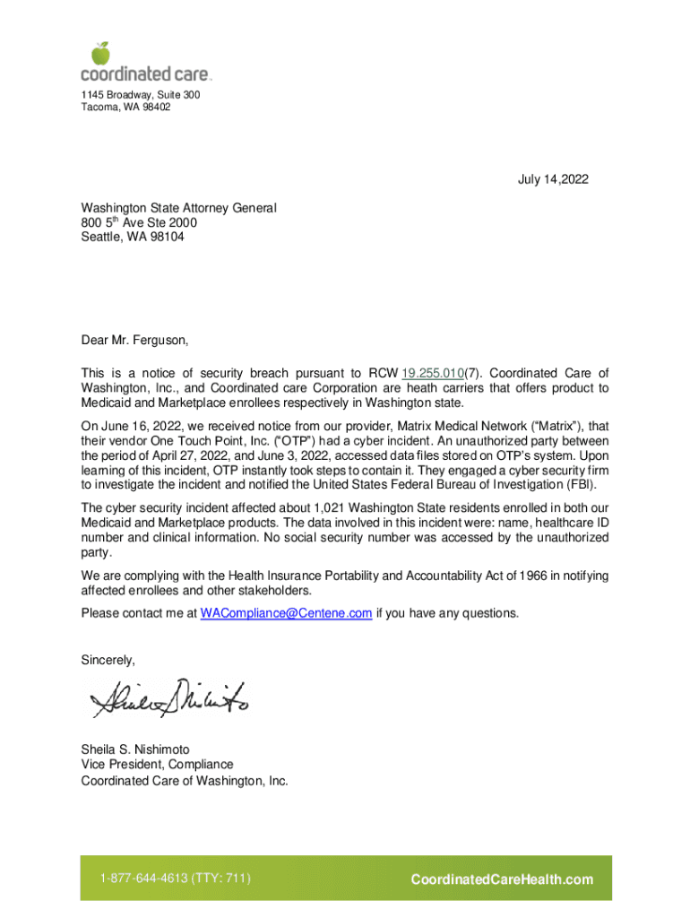 1145 Broadway, Suite 300 Tacoma, WA 98402July 14, 2022 Washington State Attorney General 800 5th Ave Ste 2000 Seattle, WA 98104Dear Mr. Ferguson, This is a notice of security breach pursuant to RCW