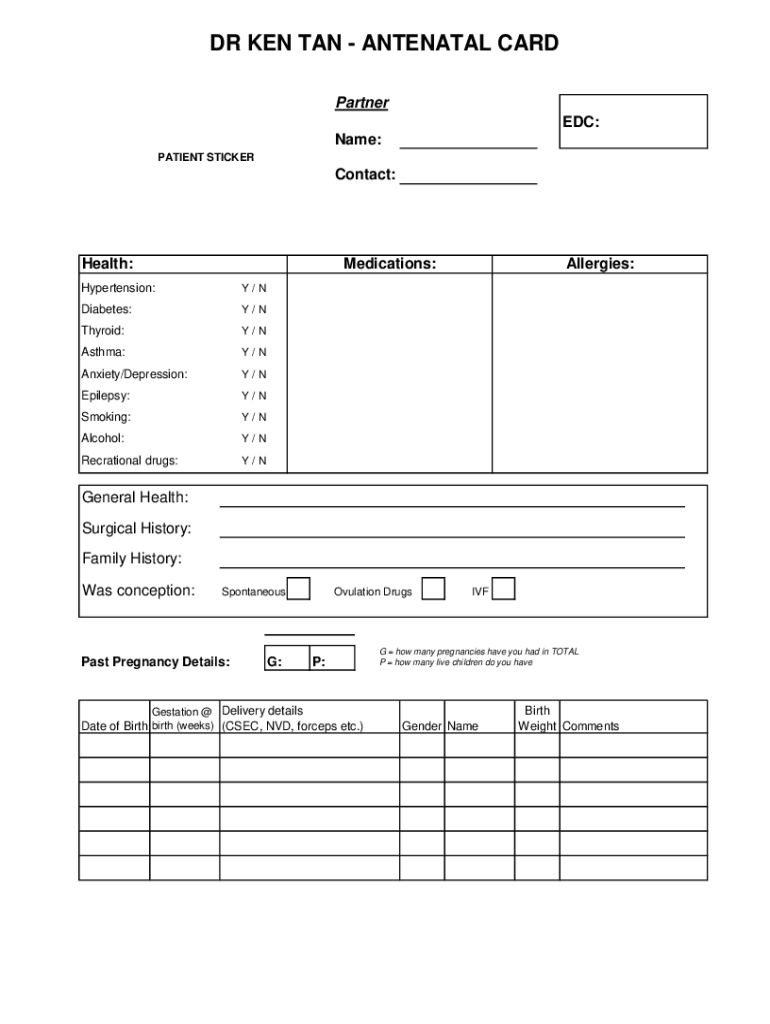 DR KEN TAN ANTENATAL CARD Partner EDC: Name: PATIENT STICKERContact:Health:Medications:Hypertension:Y/Diabetes:Y/Thyroid:Y/Asthma:Y/Anxiety/Depression:Y/Epilepsy:Y/Smoking:Y/Alcohol:Y/Recreational