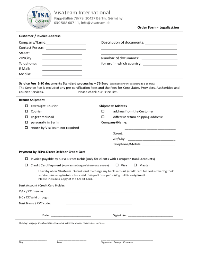 030 588 607 11, info@visateam.deOrder Form LegalizationCustomer / Invoice AddressCompany/Name:___