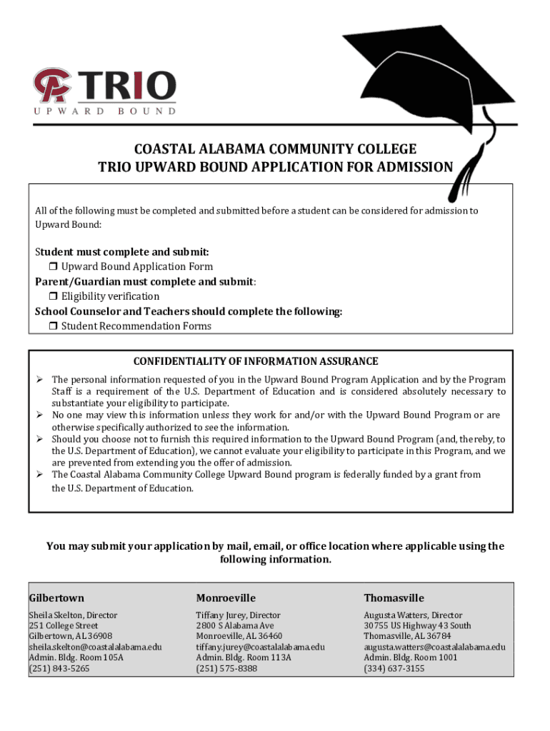 COASTAL ALABAMA COMMUNITY COLLEGETRIO UPWARD BOUND APPLICATION FOR Admission of the following must be completed and submitted before a student can be considered for admission toward Bound:Student must complete and submit:r