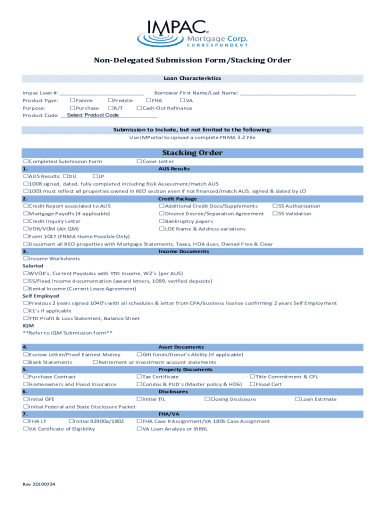 Delegated Submission Form/Stacking Order Loan Characteristics Impact Loan #: ___ Borrower First Name/Last Name: ___ Product Type: Fannie Freddie FHA VA Purpose: Purchase R/T Washout Refinance Select