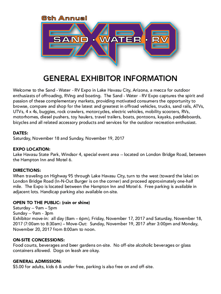 6th Annuals AND WATER GENERAL EXHIBITOR INFORMATION Welcome to the Sand Water RV Expo in Lake Havasu City, Arizona, a mecca for outdoor enthusiasts of offloading, Ring and boating. The Sand Water