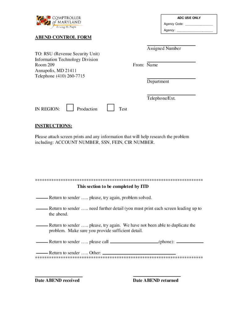ADC USE ONLY Agency Code: ___ Agency: ___BEND CONTROL FORM Assigned Number TO: RSU (Revenue Security Unit) Information Technology Division Room 209 Annapolis, MD 21411 Telephone (410) 2607715From: