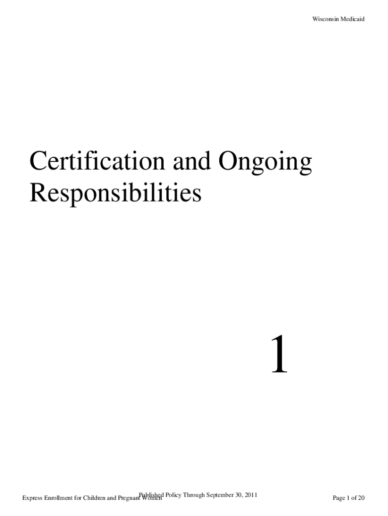 Wisconsin MedicaidCertification and Ongoing Responsibilities1 Express Enrollment for Children and PregnantPublished Women Policy Through September 30, 2011Page 1 of 20Wisconsin MedicaidArchive Date:10/03/2011Certification