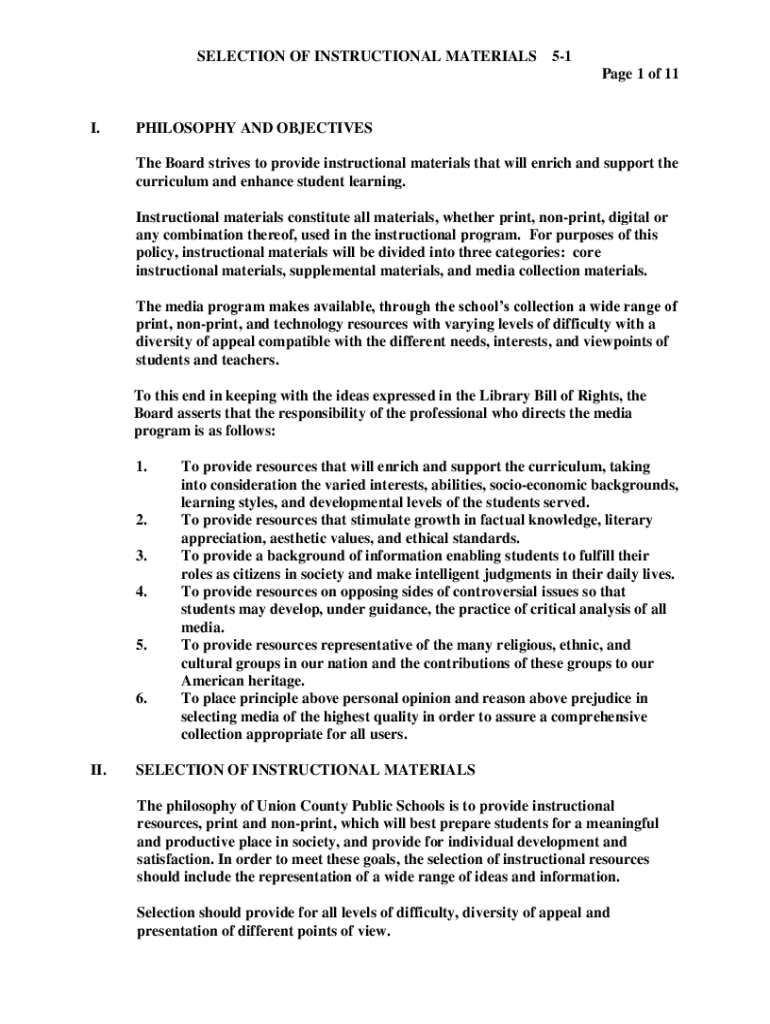 SELECTION OF INSTRUCTIONAL MATERIALS51 Page 1 of 11I.PHILOSOPHY AND OBJECTIVES The Board strives to provide instructional materials that will enrich and support the curriculum and enhance student