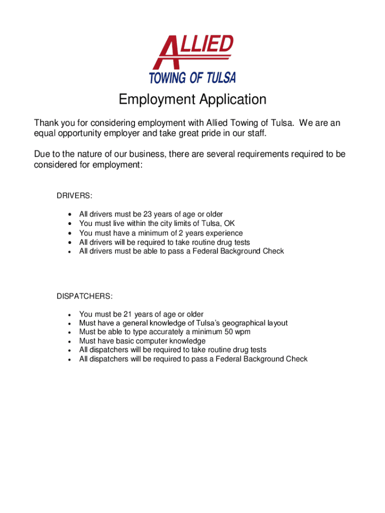Employment Application Thank you for considering employment with Allied Towing of Tulsa. We are an equal opportunity employer and take great pride in our staff. Due to the nature of our business,