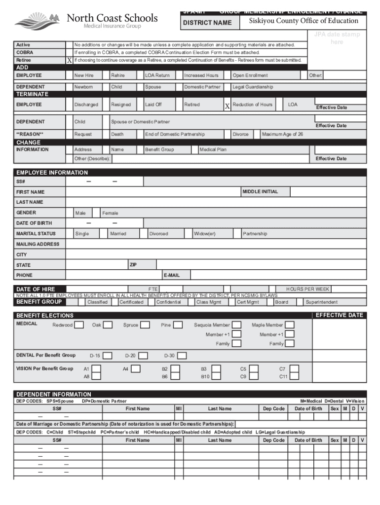 JPAM1North Coast SchoolsGROUP MEMBERSHIP ENROLLMENT / CHANGESiskiyou County Office of EducationDISTRICT Paramedical Insurance GroupchoolsActiveJPA date stamp