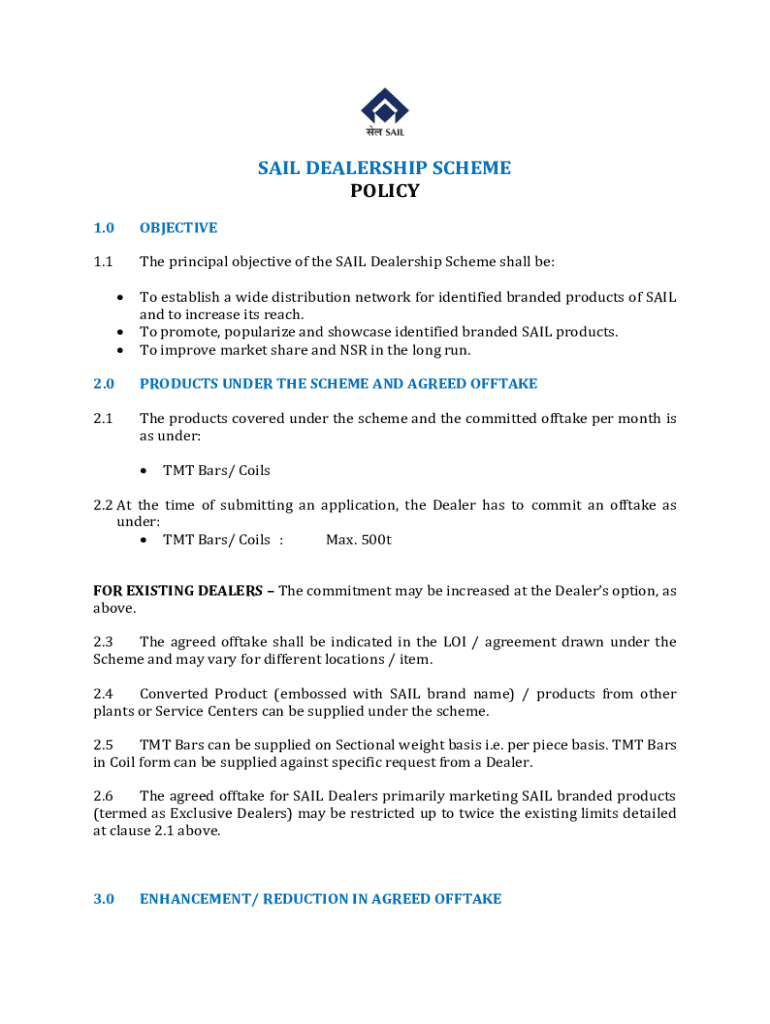 SAIL DEALERSHIP SCHEME POLICY 1.0OBJECTIVE1.1The principal objective of the SAIL Dealership Scheme shall be: To establish a wide distribution network for identified branded products of SAIL and to