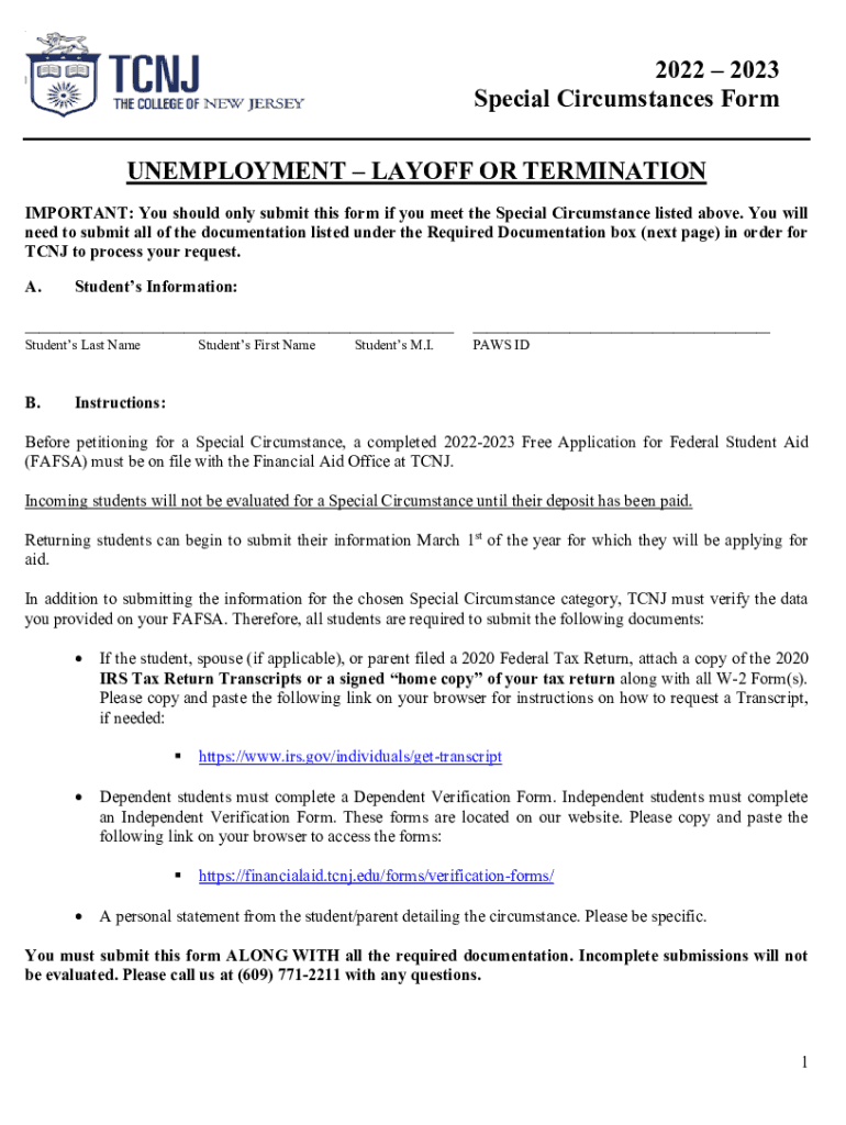2022 2023 Special Circumstances Form UNEMPLOYMENT LAYOFF OR TERMINATION IMPORTANT: You should only submit this form if you meet the Special Circumstance listed above. You will need to submit all the