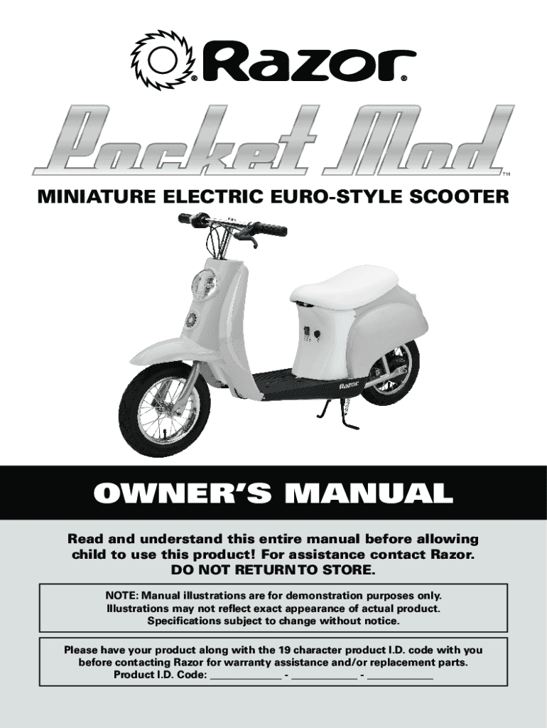 MINIATURE ELECTRIC TURNSTILE SCOOTEROWNERS MANUAL Read and understand this entire manual before allowing child to use this product! For assistance contact Razor. DO NOT RETURN TO STORE. NOTE: Manual