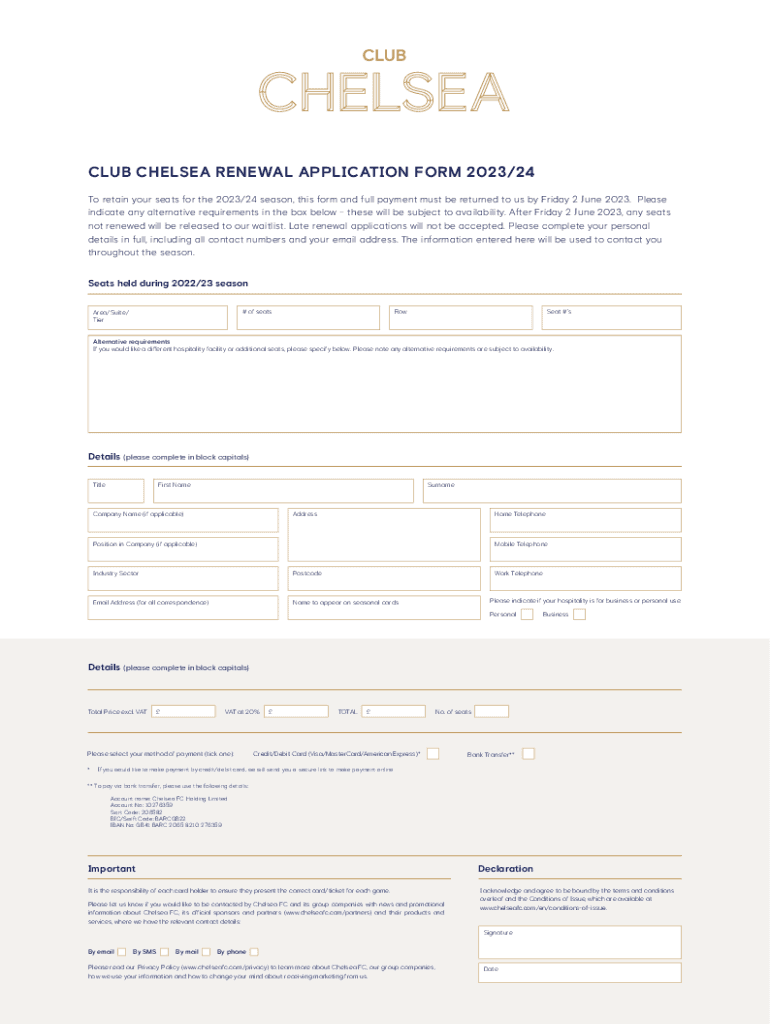 CLUB CHELSEA RENEWAL APPLICATION FORM 2023/24 To retain your seats for the 2023/24 season, this form and full payment must be returned to us by Friday 2 June 2023. Please indicate any alternative