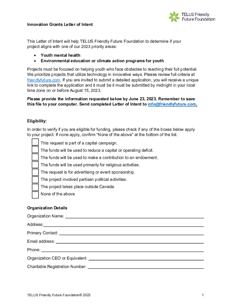 Innovation Grants Letter of Intentions Letter of Intent will help TELUS Friendly Future Foundation to determine if your project aligns with one of our 2023 priority areas: Youth mental health Environmental