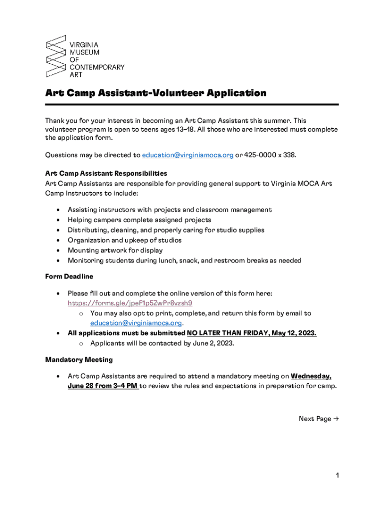 Art Camp AssistantVolunteer Application Thank you for your interest in becoming an Art Camp Assistant this summer. This volunteer program is open to teens ages 1318. All those who are interested must