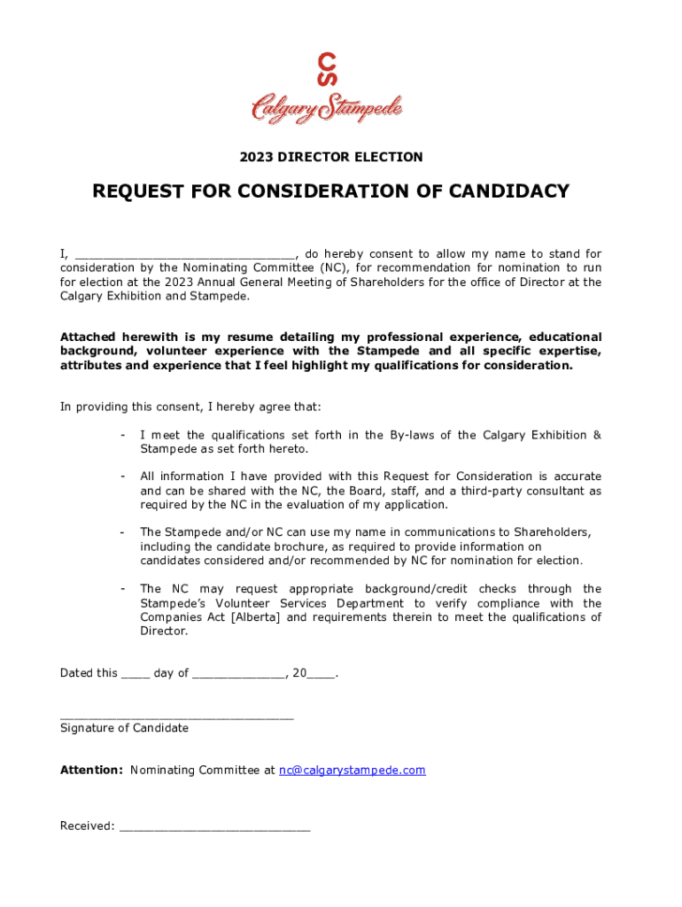 2023 DIRECTOR ELECTIONREQUEST FOR CONSIDERATION OF CANDIDACY I, ___, do hereby consent to allow my name to stand for consideration by the Nominating Committee (NC), for recommendation for nomination