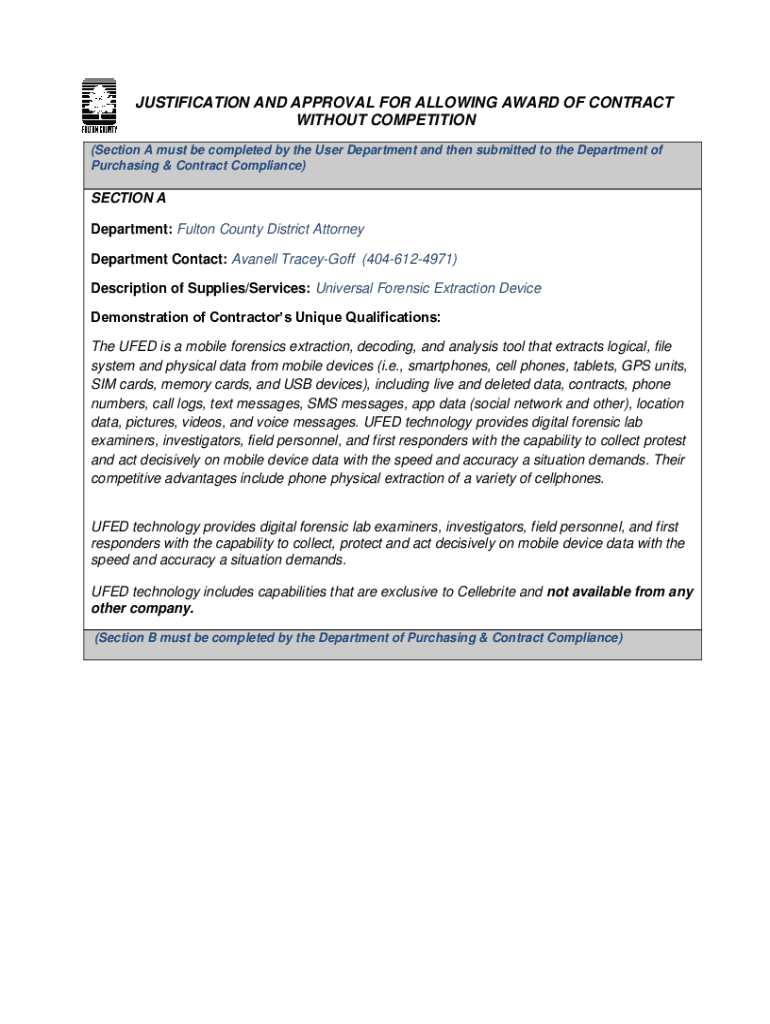 JUSTIFICATION AND APPROVAL FOR ALLOWING AWARD OF CONTRACT WITHOUT COMPETITION (Section A must be completed by the User Department and then submitted to the Department of Purchasing & Contract Compliance)SECTION