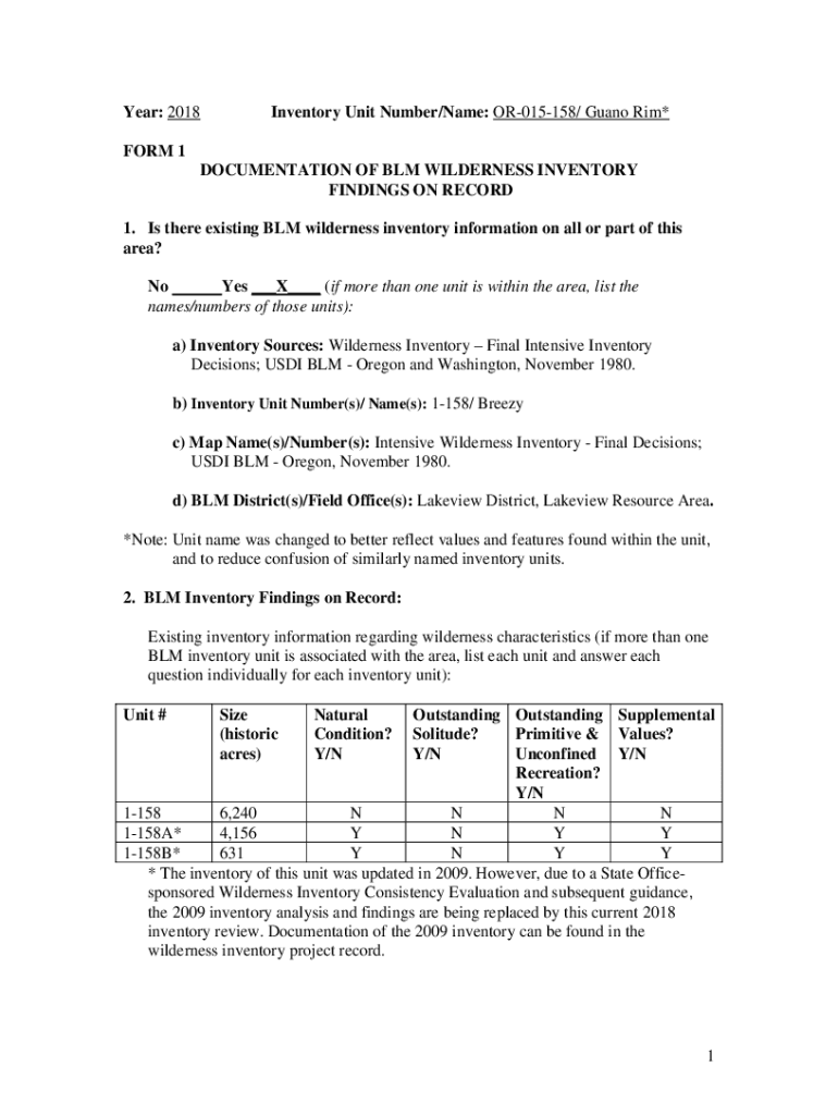 Year: 2018Inventory Unit Number/Name: OR015158/ Guano Rim×FORM 1 DOCUMENTATION OF BLM WILDERNESS INVENTORY FINDINGS ON RECORD 1. Is there existing BLM wilderness inventory information on all or part