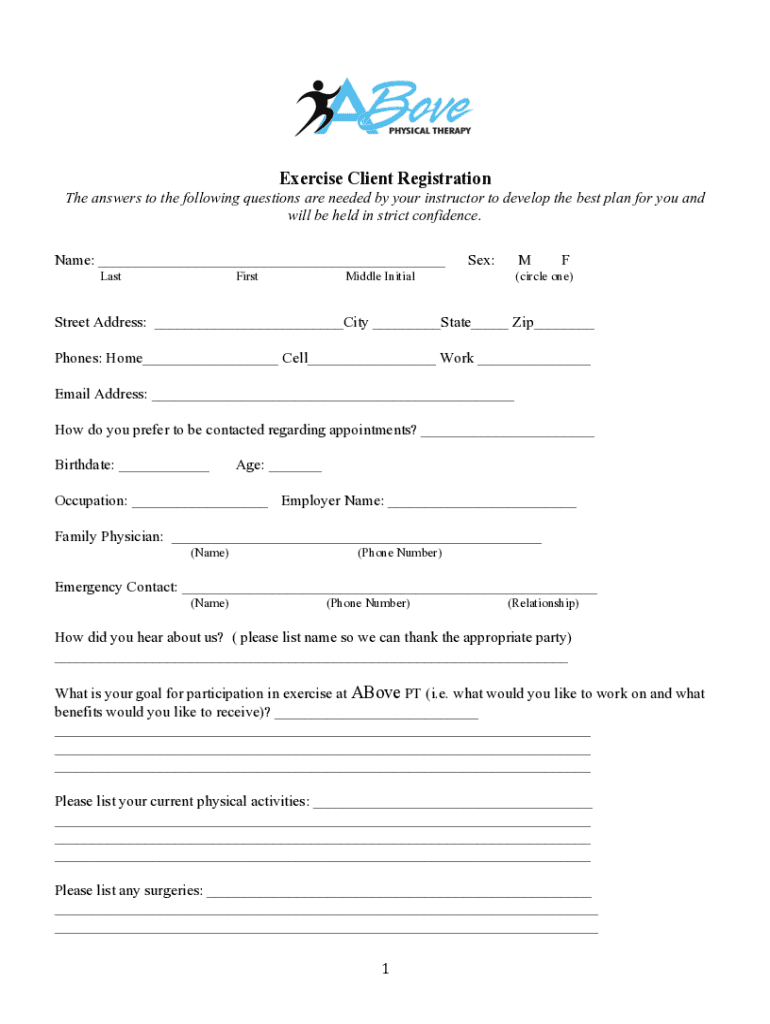 Exercise Client Registration The answers to the following questions are needed by your instructor to develop the best plan for you and will be held in strict confidence. Name: ___ LastFirstSex:Middle